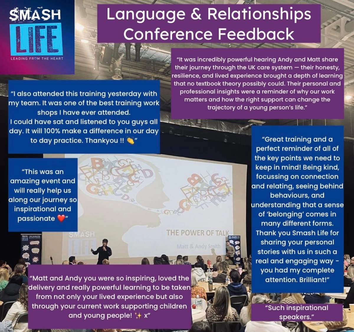 Catering to young people and professionals, our Talks focus on Adverse Childhood Experiences, Abuse, Complex Trauma and Safeguarding and are designed to help professionals understand children and young peoples’ behaviour, change approaches and perceptions and bring a reality to practice that can’t be obtained through books. Young people will receive a hard hitting, factual story that will help them to understand that they are not alone with their own trauma’s and can build up their own skills and resilience, following the positive example set by the Smash Life brothers.